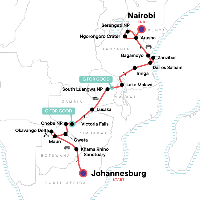 You fly into J’Burg to begin this overland tour and then return to your home country from Nairobi, Kenya which is easy to organize in terms of flights. The trip begins with visits to a rhino sanctuary and the wildness of the Okavango Delta. You then go for a game drive in Chobe National Park before a quick stopover to see the majestic Victoria Falls. I love this tour because you also get to see some of Zambia and Malawi – the warm heart of Africa. You then also have a nice break on the beaches at Zanzibar and a wonderful climax at Serengeti National Park.