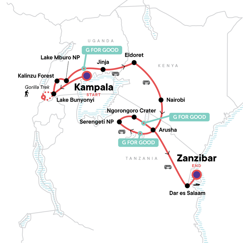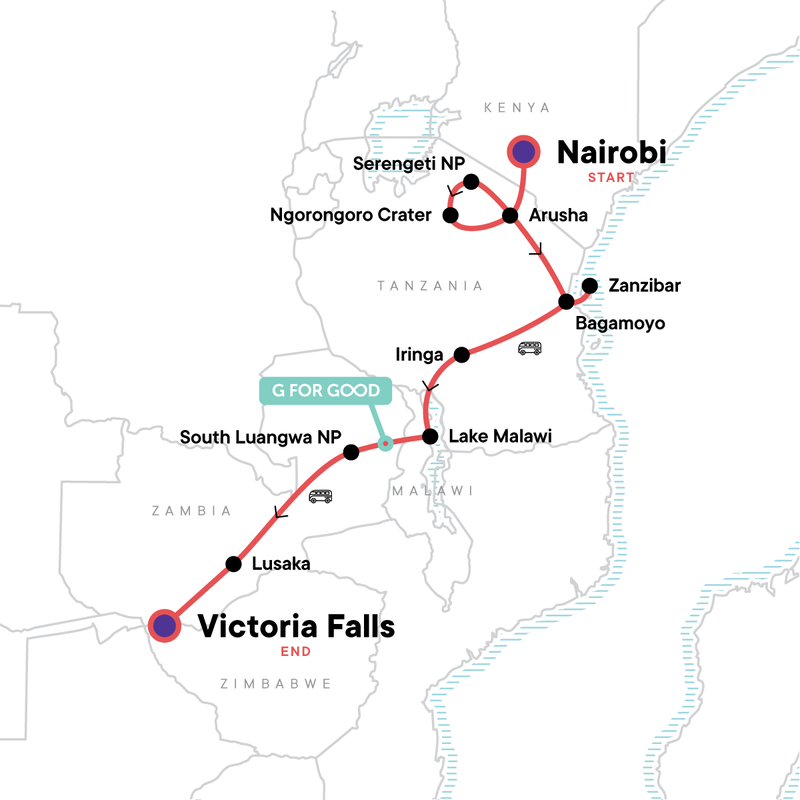 Another action packed overland tour in East Africa that travels all the way down through Malawi and Zambia. The games drives in both Serengeti National Park and Ngorongoro Crater are a highlight of any trip and the short stay in Zanzibar is a welcome break from the dusty road. You will then have the pleasure of soaking in the more primitive side of Africa in Malawi which is full to the brim of small villages with friendly locals. More games drives at South Luangwa National Park in Zambia await and once again, this overland tour finishes off at the might Victoria Falls!