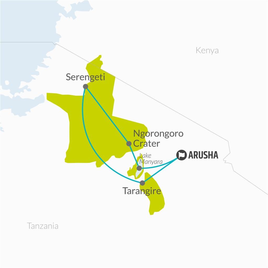 This 6-day tour starts and ends in Arusha, Tanzania. You take a trip to Lake Manyara National Park en-route and enjoy an incredible wildlife safari in Ngorongoro Crater. The tour includes ample time in Serengeti National Park and then takes you to Tarangire National Park before returning to Arusha.